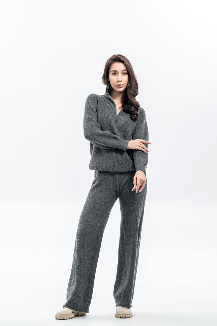 Чёрный трикотажный костюм, свитер и трикотажные брюки.